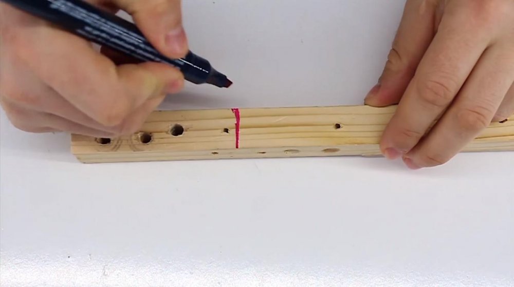 - Брусок с обеих сторон просверливаются. В результате образовываются аккуратные отверстия, которые обязательно должны быть параллельны относительно друг друга. Одно из проделанных отверстий будет использовано, чтобы надежно закрепить указку, а в другое поместиться шнур строительный.