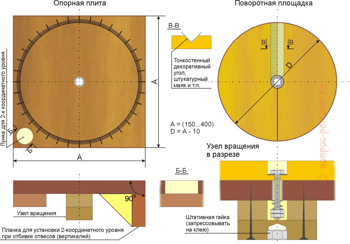 Лимб (градусную шкалу) полностью размечать не обязательно; достаточно в каждом квадранте сделать отметки 30, 45 и 60 градусов. Лоток под укладку лазерной указки выбирается кромочным рубанком (можно воспользоваться рубанком для гипсокартона). Самый излучатель закрепляется в лотке полосками резины на саморезах. В перпендикулярной опорной плите планке для выравнивания прибора при отбивке отвесов, также выбирается лунка под круглый уровень. Кромки деталей после распиловки пропитываются строительным экогрунтом (водно-полимерной эмульсией) и прокрашиваются. Под головку болта поворотного узла подкладывается шайба (лучше 2-3). В опорную плиту под болт запрессовывается втулка из металлической трубки. В собранном приборе поворотная площадка должна плотно всей пластью лечь на опорную плиту, вращаясь с некоторым трением.