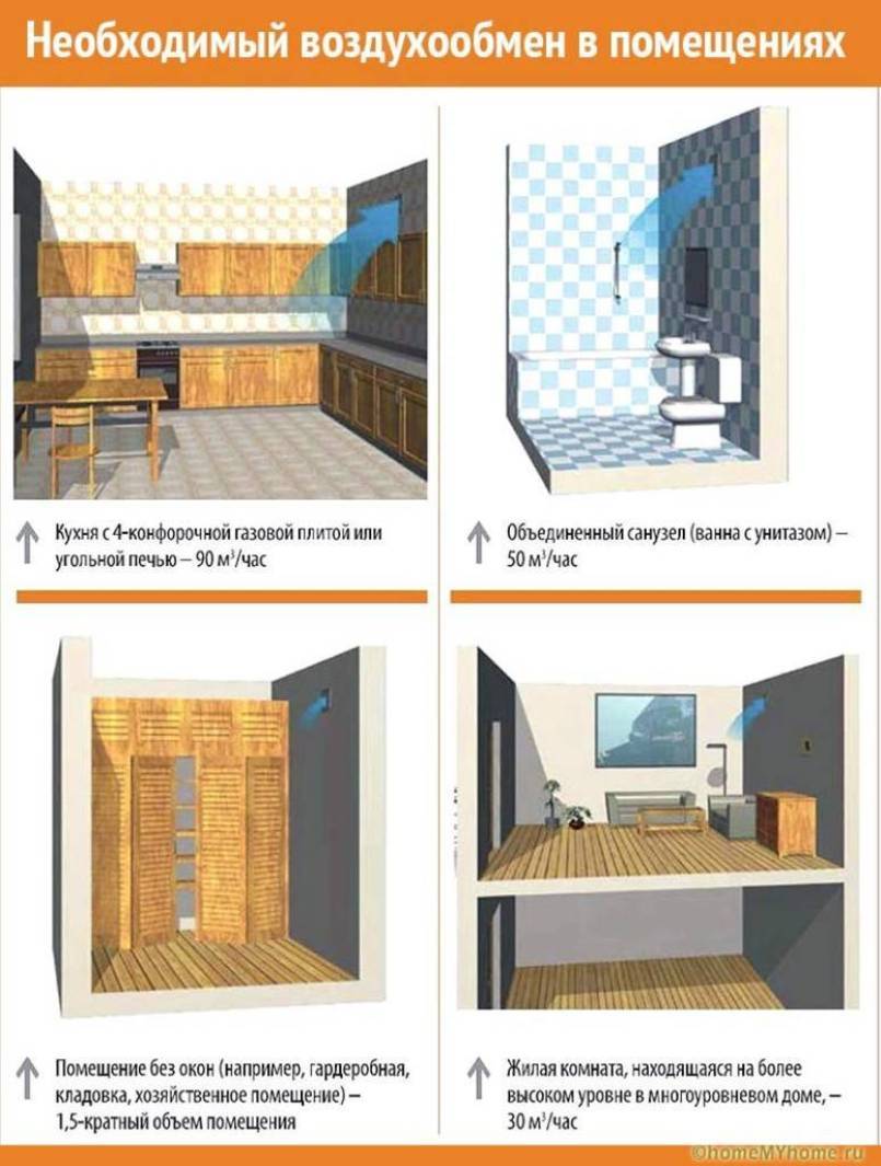 Различаются и требования к показателю воздухообмена в разных помещения квартиры: