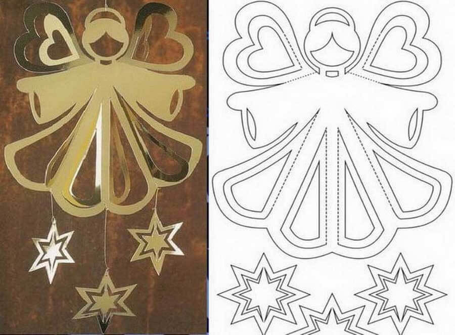 - Из плотной бумаги вырезать звёзды, прикрепить их с помощью ниток на платье ангела. А также сделать петельку для того, чтобы получилась подвесная игрушка.