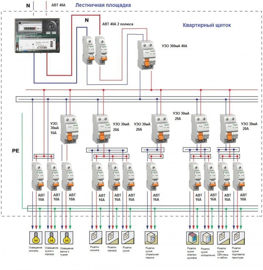 Даже если квартирный щиток считать водным автоматом (что сделать довольно-таки проблематично), такое подключение будет неправильным согласно другому требованию, а именно – PE проводник должен быть повторно заземлен, чего в этажном щитке добиться невозможно.