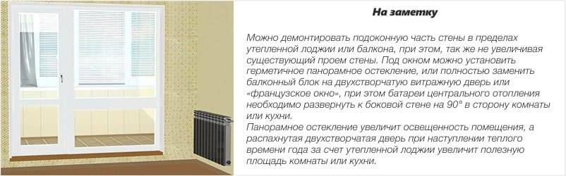 При объединении комнат их температурный режим должен совпадать. Поэтому присоединяемое помещение лоджии следует отапливать. Вынос батареи центрального отопления на балконное помещение запрещен, на данное действие необходимо получать разрешение. Альтернативой может стать установка радиатора на смежную стену, или прокладывание теплого пола.