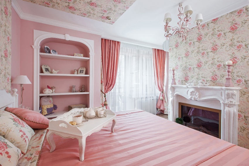 Оклеенные обоями стены должны создавать атмосферу старины, роскошной и наивной одновременно, поэтому милые рисунки, природные фактуры и состаренные участки будут смотреться очень романтично, добавляя характерного колорита обстановке.