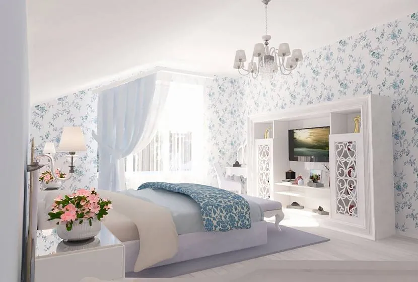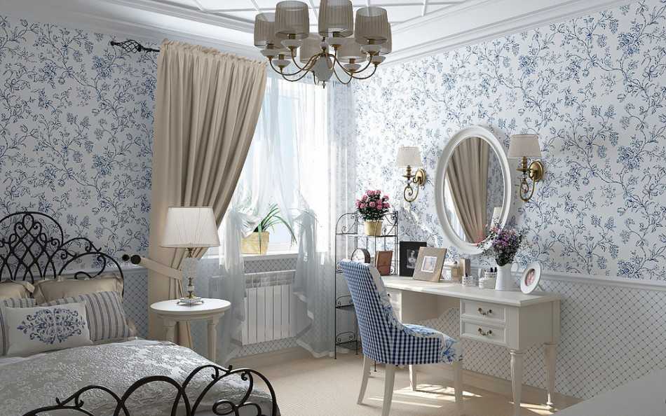 Прованский стиль обоев с цветным рисунком объединяет два основных цвета спальни