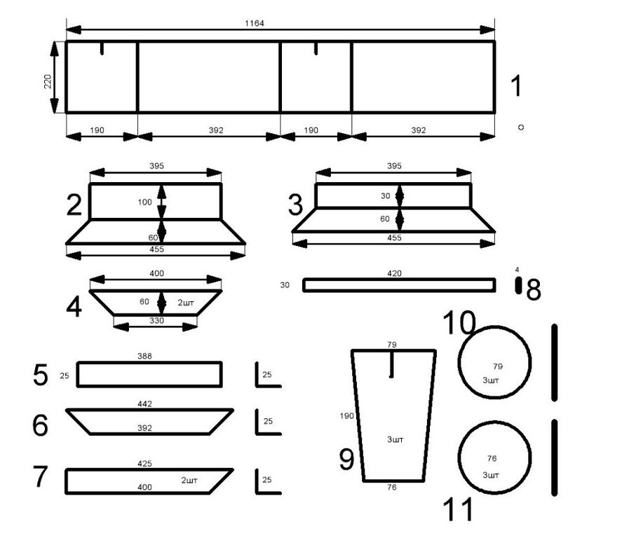 чертеж форм для шлакоблоков: 1 — матрица в развертке; 2, 3, 4 — поддоны; 5, 6, 7 — нижняя рамка матрицы делается из уголка 25х25; 8 — рейка для крепежа пустотников; 9 — пустотник; 10 — верхняя пробка пустотника; 11 — нижняя пробка пустотника