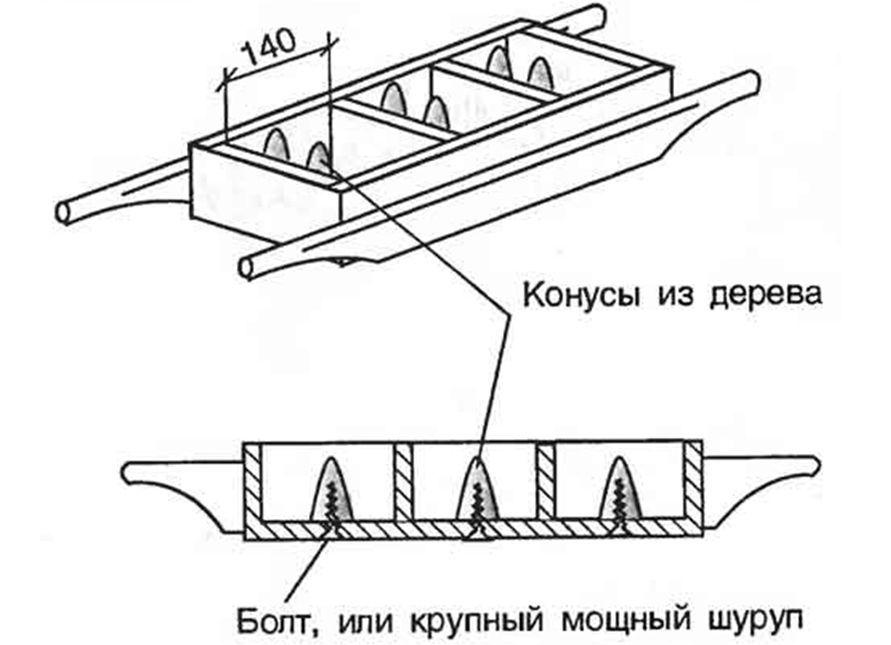 Образователи пустот в этом случае расположены сверху и представляют собой круглые или квадратные в сечении металлические детали. Их ширина по мере углубления в полость матрицы должна становиться меньше, образуя перевернутый конус или пирамиду. Это необходимо для легкого снятия короба с изделия. Образователи пустот закреплены на стенках короба узкой металлической полосой.