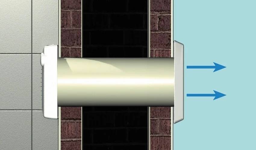 - Вытяжную трубу, в которой уже установлена пластина с наклеенной на нее пленкой, необходимо установить в вентиляционный канал, используя для этих целей дюбели или саморезы. После установки в вентиляционный канал обратного клапана надо надежно загерметизировать зазоры между стенками канала и вытяжной трубы.