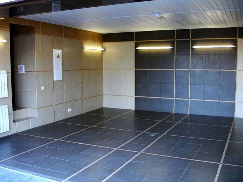 Керамическая плитка применяется для облицовки стен в любых помещениях с высокой влажностью и перепадами температуры. Это надежный и долговечный материал, легко поддающийся чистке и не требующий сложного ухода. Тем менее, кафельная отделка редко применяется в оформлении гаражей из-за довольно высокой стоимости.