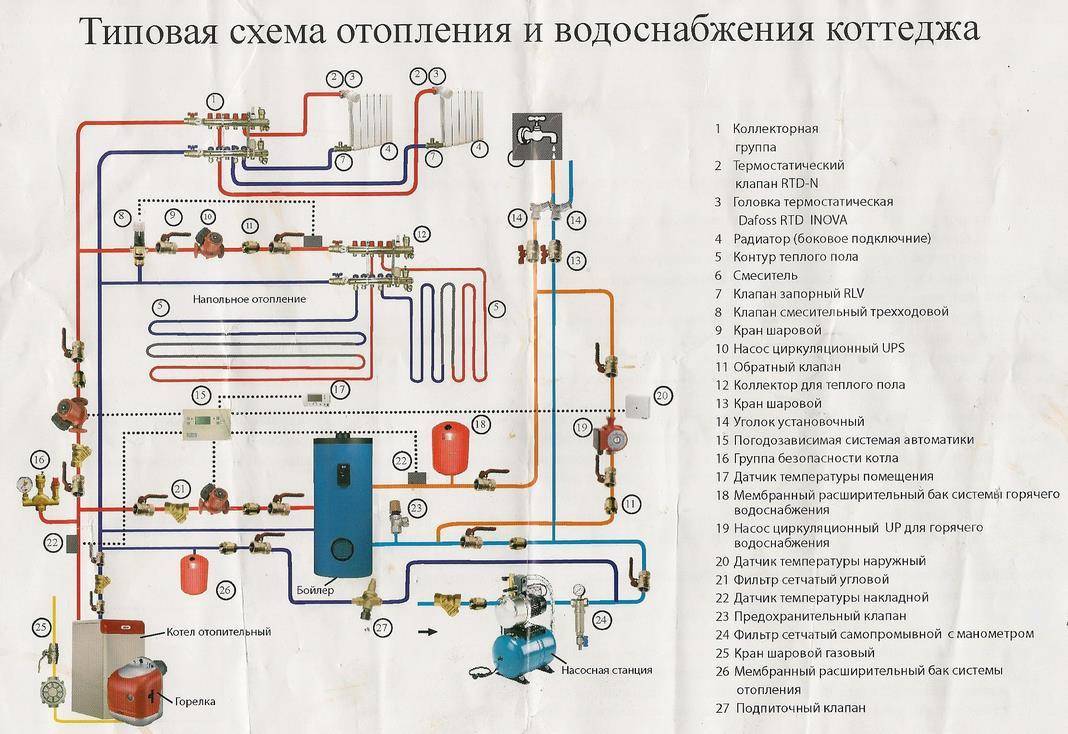 Сложность схемы обвязки зависит от наличия встроенного оборудования. Следует знать, что для напольных котлов отопления лучшими материалами обвязки являются стойкие к высокой температуре стальные или медные трубы. Температура в зоне напольного котла может достигать значений в 90 – 95С и быть предельной для целостности полимерных труб, даже стабилизированных.