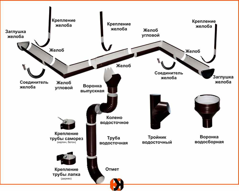 для соединения воронки с водосточной трубой используется специальная деталь – колено;