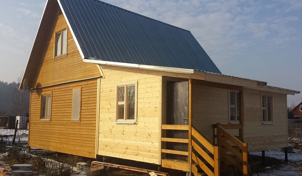 Крыша пристройки обязательно должна иметь скат наружу. Это необходимо для стока воды летом, и для сползания снега зимой.