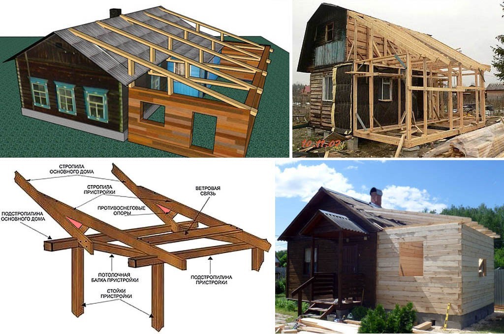 Конструктивной основой является набор стропил – балок, идущих от стены основного дома к дальней от него стене пристройки.