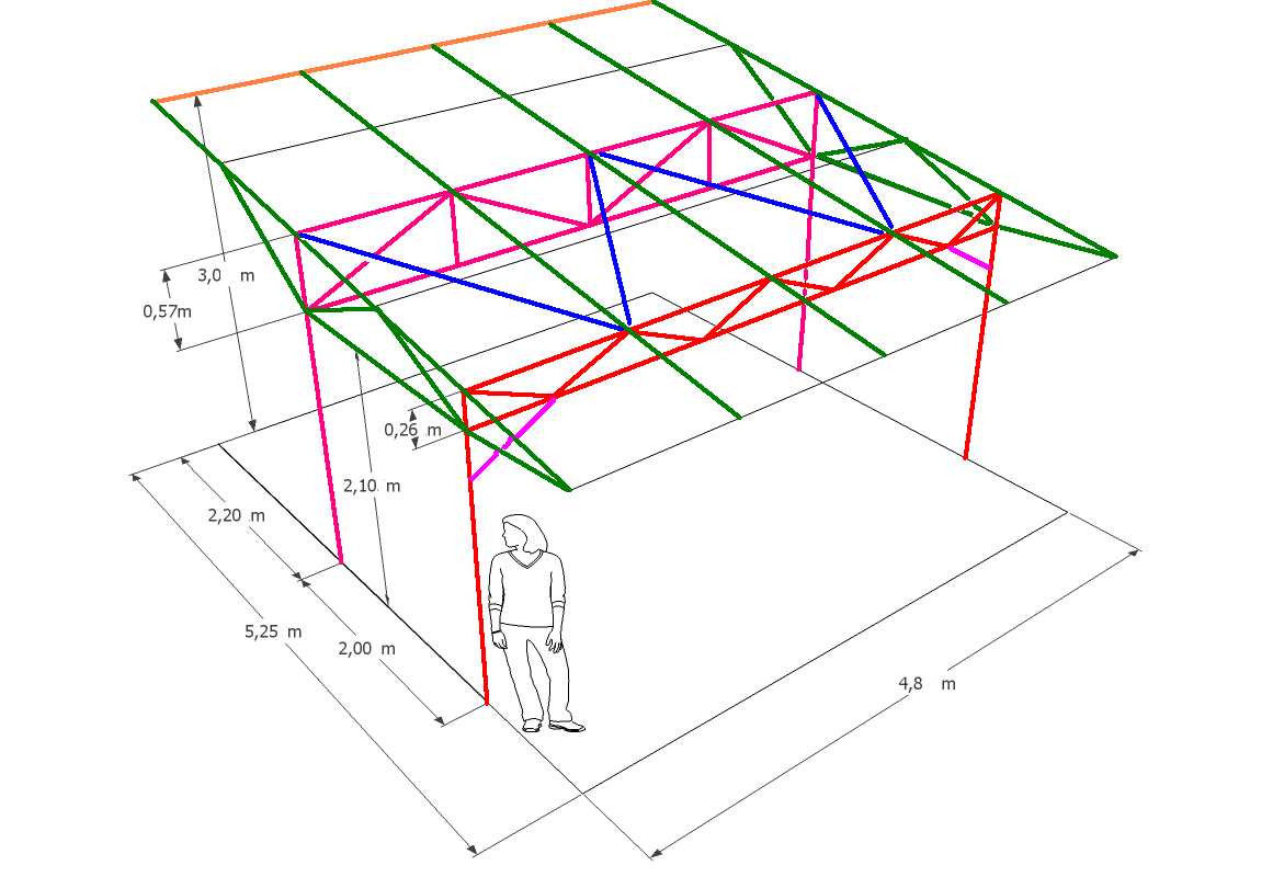 Рамы с общим уклоном не более 15º. Как правило, если речь идет об этом типе загородного дома, то он выполнен в форме трапеции. Исходя из назначения постройки, а также угла укладки крыши, владелец самостоятельно определяет высоту конструкции. Он должен основываться на показателях от 1/7 до 1/12 длины здания. Каркас крыши трапециевидной формы изготавливается из металлических панелей, длина которых должна составлять от 1,5 до 2,5 метров. Если на чертеже фермы из профильной трубы не предусмотрен подвесной потолок, вместо раскосов можно использовать решетку треугольной формы