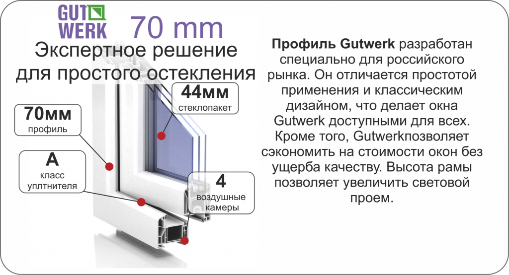 Эта система остекления подойдет для установки в любых широтах и сможет достойно выполнять свои функции как при низких, так и при высоких температурах. Разработка уникальной рецептуры производства позволила применять поливинилхлорид для разработки оконных конструкций при повышенной влажности, ветре и наледи. Испытания показали, что и в таких погодных условиях, профиль способен сохранять свои первоначальные эксплуатационные свойства. То что многие считают Gutwerk бюджетным вариантом остекления, является ошибочным. Не смотря на скромную монтажную глубину, эта коллекция воплотила в себе многие качества, которые присущи окнам высокого класса. Несмотря на это стоимость таких окон осталась на вполне достойном уровне и конкурирует с бюджетными вариантами остекления от некоторых производителей. Стоит заметить, что для наиболее высоких изоляционных свойств, более подходящей колекцией может стать коллекция КВЕ Эксперт.