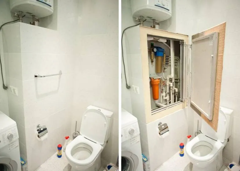 Трубы в ванной комнате или туалете можно зашить гипсокартоном, но при этом оставить к ним доступ, сделав одну из секций съемной на магнитах либо на петлях.