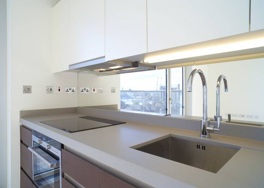 Не оставляйте «в темноте» мойку и плиту. Раковину можно подсвечивать, как столешницу, с одним отличием: светильники выбирать влагозащищенные (IP44). Подсветку плиты удобно организовывать при помощи ламп, встроенных в вытяжку. Такие светильники должны быть устойчивы еще и к высокой температуре.