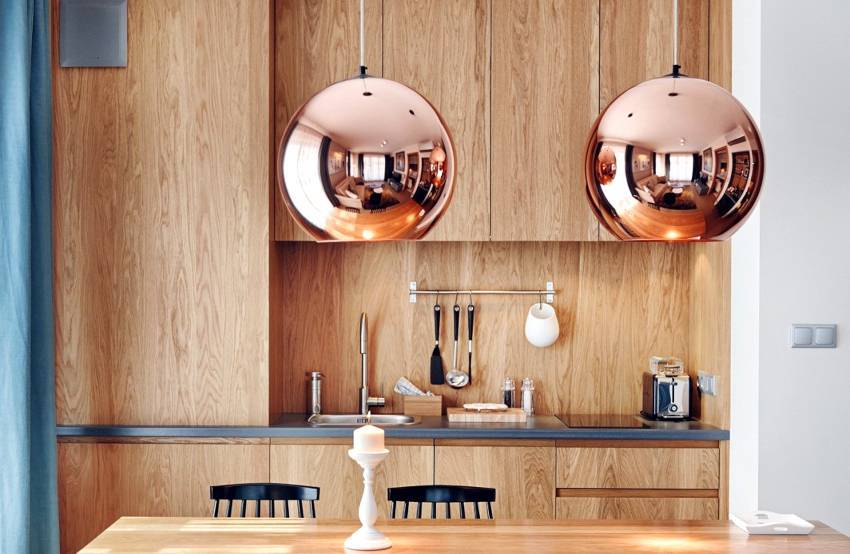 Точечные светильники лучше всего подходят для рабочей зоны. Для обеденного пространства и места отдыха оптимальным выбором является люстра или прижатый к потолку плафон.