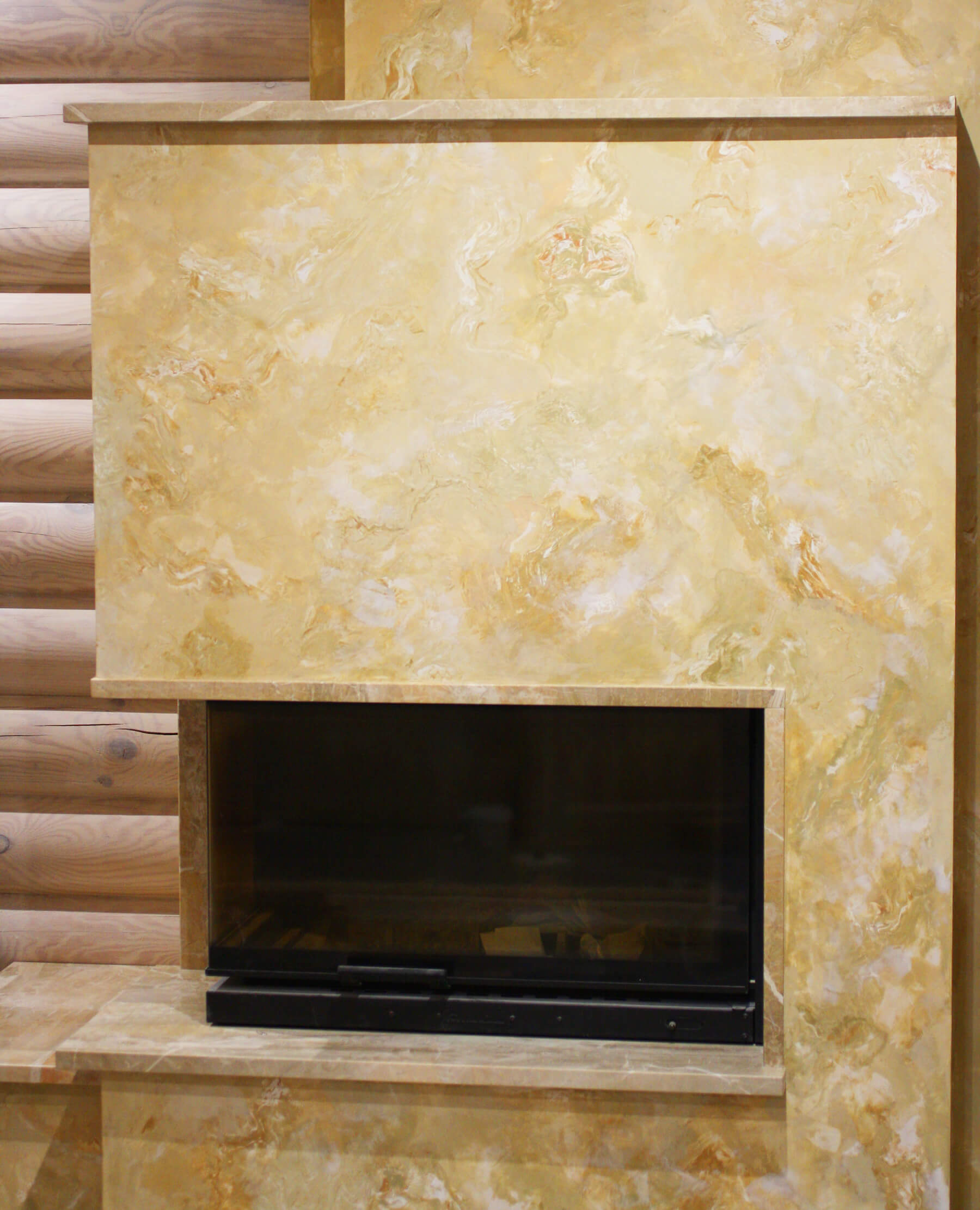 Фото 3. Камин с облицовкой из акрилового камня, окрас которого напоминает натуральный мрамор.