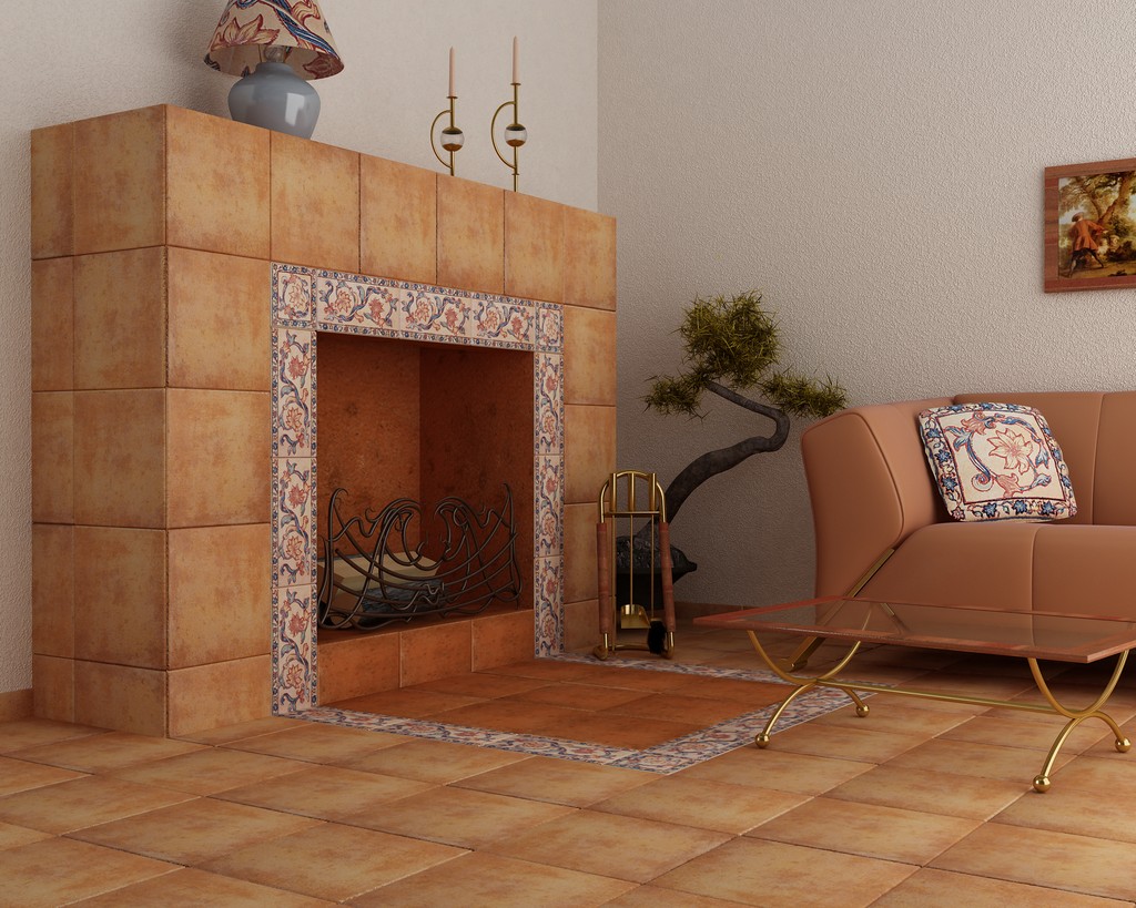 Изразцы – это, по сути, та же терракотовая плитка или майолика. Отличие кроется в особом строении. У изразцов есть румпа, квадратный полый выступ, которым плитка крепится в процессе монтажа. Румпа важна и с другой целью – она помогает удерживать тепло. Изразцами можно отделать камин только во время его кладки. Если момент упущен, то придется выбирать другой способ отделки.