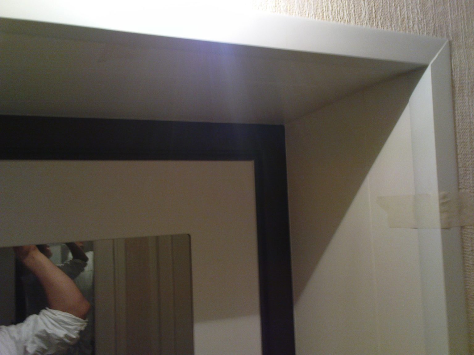 - Делаем с помощью острого ножа углубление в монтажной пене, которая находится между проемом и коробкой двери, вставляем боковую заготовку из гипсокартона.
