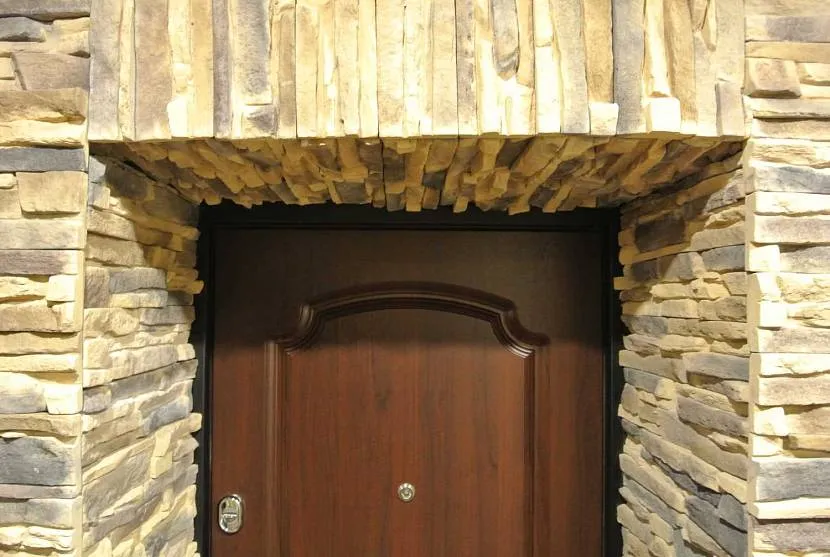 Синоним надёжности и долговечности. Такие откосы простоят весь срок службы двери и даже больше. Искусственный камень дешевле и проще в укладке, природный — красивее, необычнее. В качестве камня подойдёт также кирпич или его имитация.