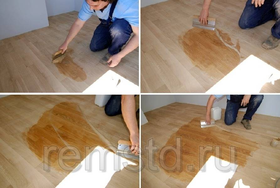 Также покрывной материал можно разогреть утюгом, через ткань или бумагу. Небольшой участок пола накрывают тканью, проглаживают. После этого краску удаляют шпателем, а её остатки шлифуют или растворяют (применяют специальные смывки).