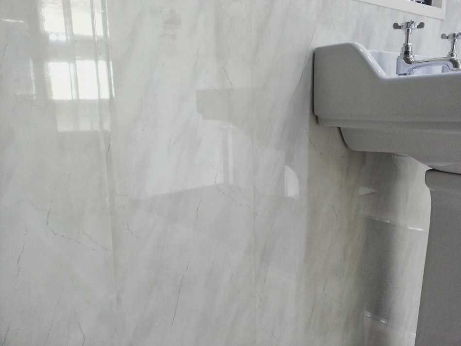 Если же свойства плитки вам принципиально важны, но «стены в клеточку» вам не нравятся, можно использовать панели из широкоформатного керамогранита. По сути это та же плитка, но очень тонкая, чтобы быть легкой, и большой площади — может достигать размера более 1×3 м. При разумной планировке облицовки швов на стенах практически не будет.