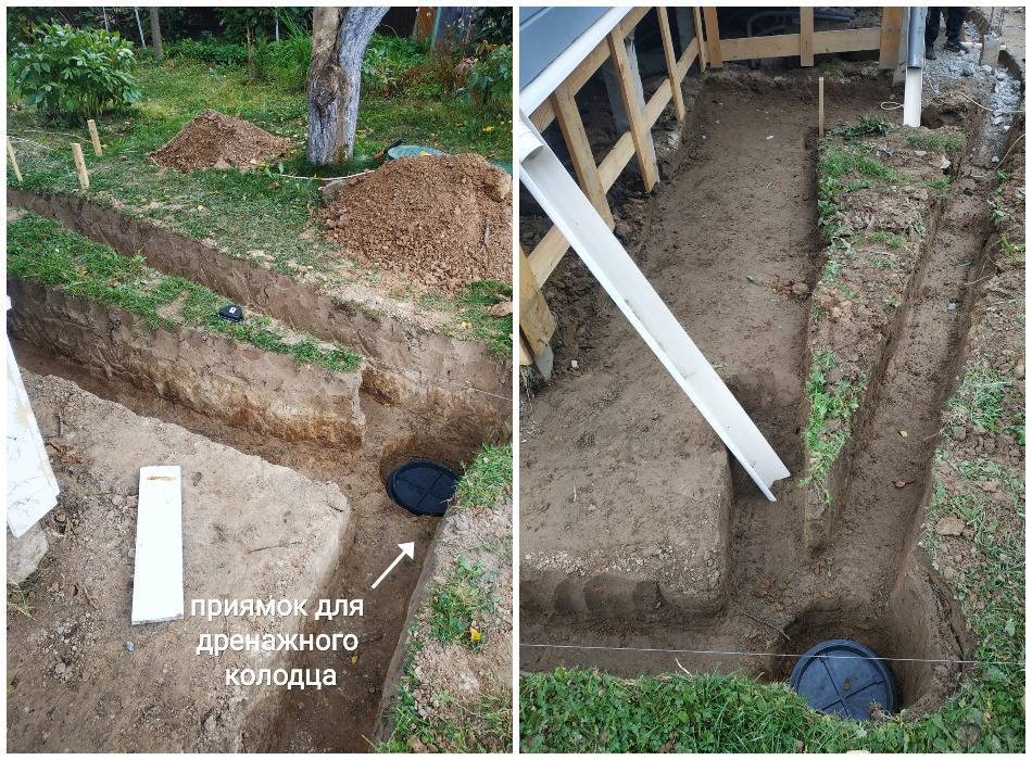 А ширина траншеи выбирается с учетом того, чтобы вода попадала не на почву, а на отмостку, но не менее 15-29 см от свеса крыши.