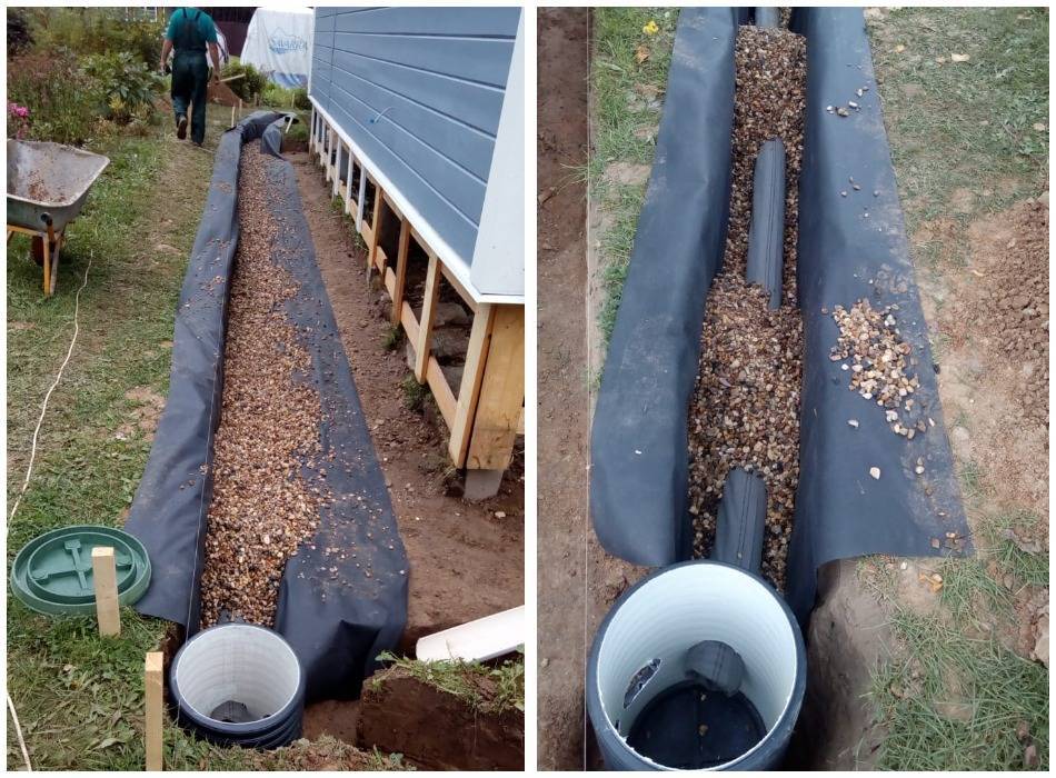 Дренажная система – это ближайший «смежник» отмостки. Она тоже работает на защиту строения от влаги, она отводит лишнюю воду за пределы участка. Трубы дренажной системы укладывают в траншеях ниже уровня отмостки. При этом обеспечивают непрерывный отрицательный уклон с понижением в сторону точки ухода воды с участка.