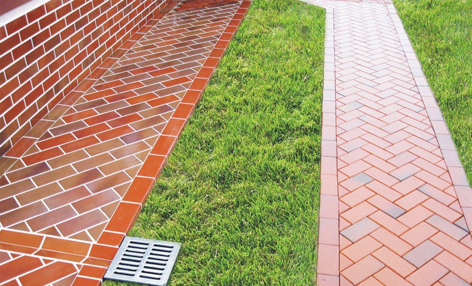 - Полужесткое мощение из клинкерного кирпича, тротуарной плитки или брусчатки укладывают с обязательным устройством гидроизоляционного слоя. Гидроизоляцию отмостки вокруг дома выполняют с использованием геомембраны или бетонного основания.