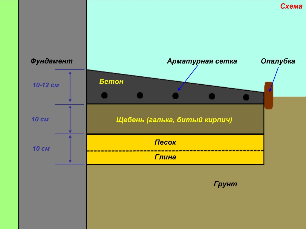 Пирог состоит из слоя песка толщиной до 10 см и щебня — до 10 см. Армирование сеткой или проволокой из металла обязательно. Сверху принято заливать жидкий бетонный раствор, потом — выравнивающую стяжку.