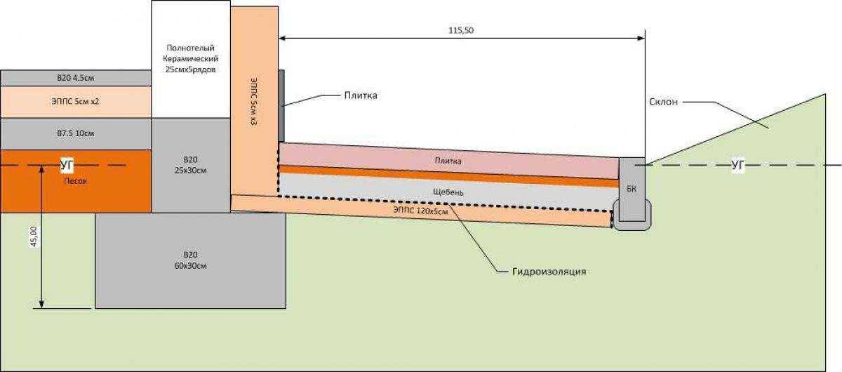 - Угол уклона, обеспечивающий отведение воды от фундамента.