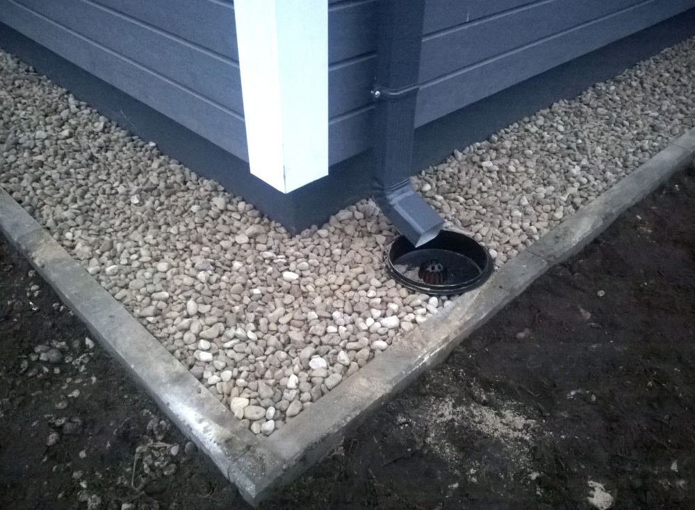 Если дренажные трубы не были проведены заранее, лучше устроить водоотведение поверх готовой отмостки. Разрезанную трубу можно наполовину закопать в грунт и сделать канавку. Главное: герметичное соединение стыков и соблюдение наклона.