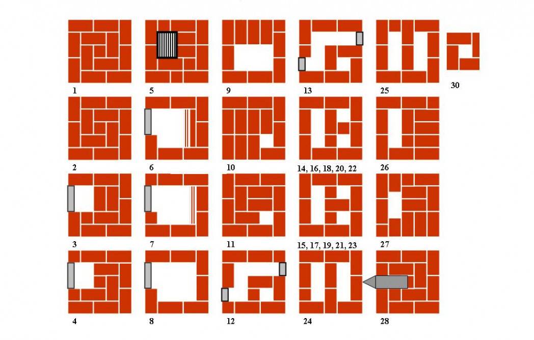 Она представляет собой последовательность укладки каждого кирпича в печке. Сама конструкция может быть совершенно разной. Может быть использование кладки 3 на 3, 3 на 4 или какие-либо другие варианты. Каждая разновидность должна создаваться тщательно и правильно, причем все виды обладают своими специфическими особенностями и нюансами. Поэтому создание порядовки является обязательным этапом, после реализации которого, начинается непосредственная работа по созданию печки. Следует помнить, что во время этого процесса должен применяться специальный кладочный раствор, а также часто возникает необходимость в половинках или четвертинках строительного материала, которые можно приобрести уже в готовом виде или сделать самостоятельно.