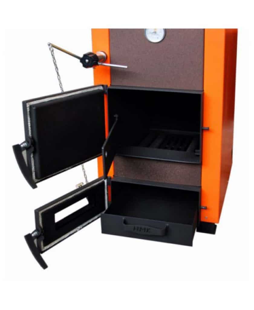Фото 2. Дровяной котёл НМК Сибирь-Gefest КВО 15 ТЭ. Устройство выполнено в сочетании черного и оранжевого цвета.