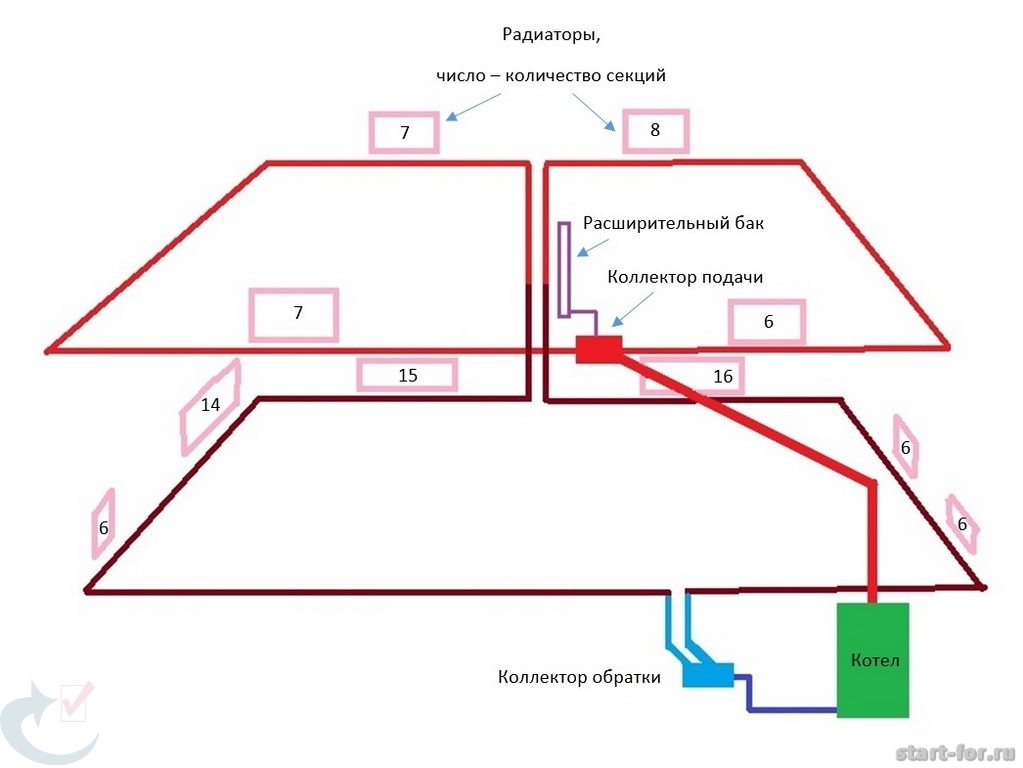 С коллекторной схемой всем понятно. Есть коллектор с выходами по количеству радиаторов. Каждый подключаем отдельно от самого коллектора самой тонкой трубой 16 мм.