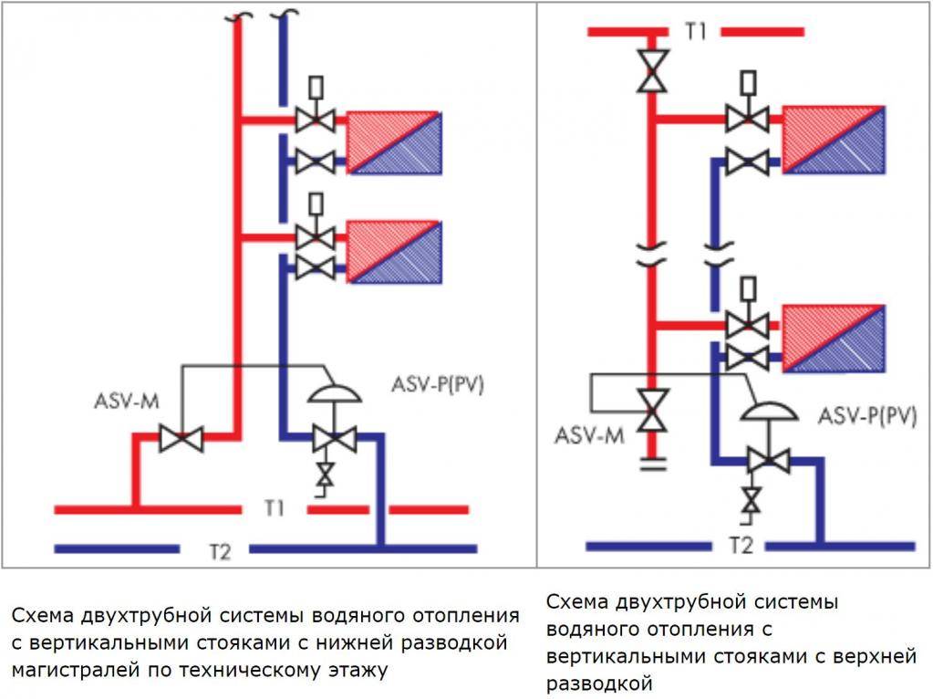 - Двухтрубную. Характеризуется наличием двух магистралей – подающей и обратной. Подключение каждого радиатора в ней индивидуально. Есть варианты, при которых оба трубопровода располагаются наверху, внизу, либо подающий наверху, а обратный – внизу. Двухтрубная схема отопления частного дома – идеальный вариант для построек с двумя и более этажами.