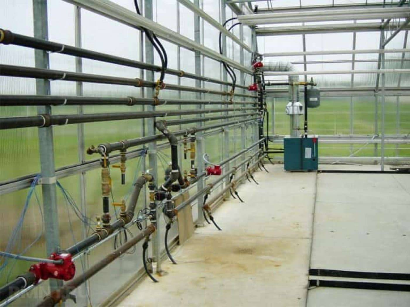 Водяное отопление считается самым эффективным и выгодным в экономическом плане. Для этого требуется твердотопливный или газовый котел для нагрева воды и несколько труб. Как вариант — нагрев воды бойлером с последующей закачкой в трубы при помощи насоса. Таким способом можно обогревать и воздух, и грунт. Сделать монтаж водяного обогрева теплицы своими руками вполне по силам хозяйственным огородникам и фермерам. Можно также подключиться к общей системе отопления отдельным контуром для автономии.