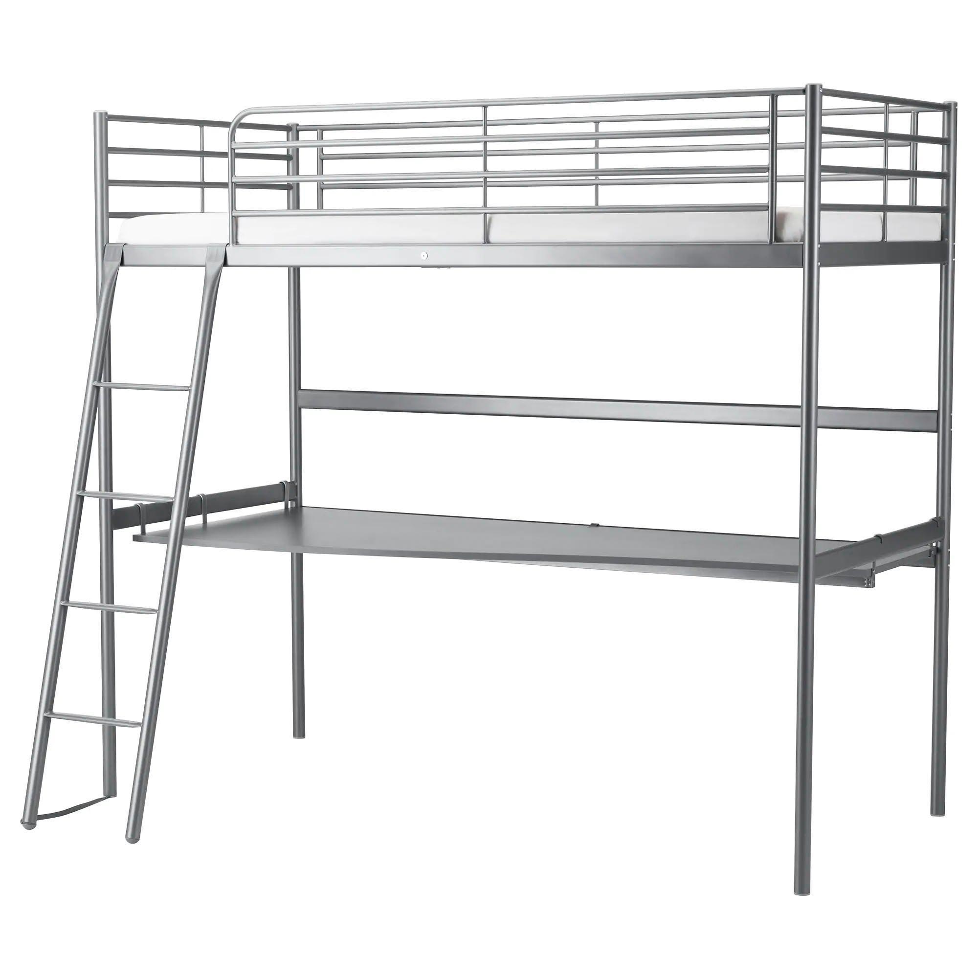 Эти варианты продаются только с одним каркасом. Чтобы обустроить место под дном кровати, необходимо докупать другую мебель. Здесь можно поставить небольшой диванчик (например, серии «Бединге»), рабочий стол с компьютером или ноутбуком, стеллаж с книгами, кресло-мешок, игровой манеж, гардероб и др.