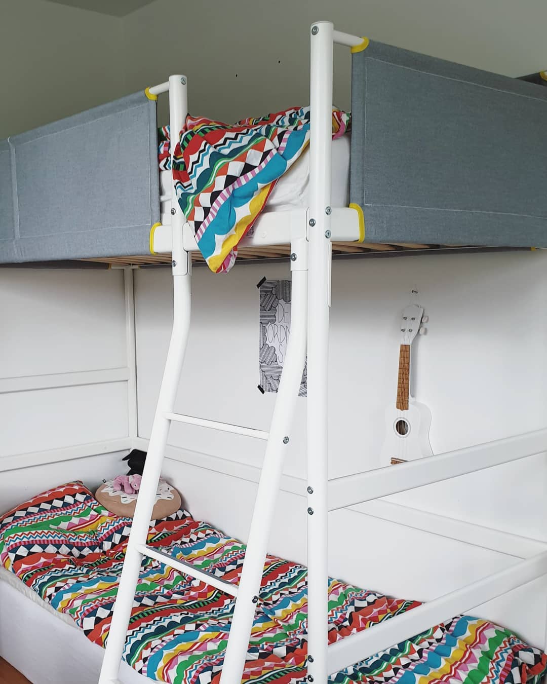 Лестницу можно установить с разных сторон. Бортики выполнены из ткани. На них также можно повесить органайзер «Мёйлигхет», где можно хранить книгу, которую вы читаете перед сном, или наушники, если перед сном вы привыкли слушать музыку или аудиокниги.