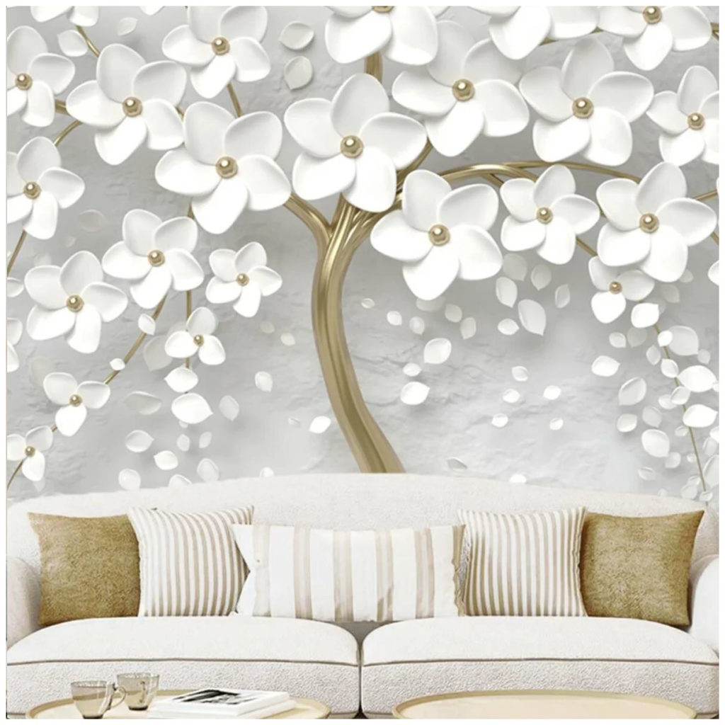 Модель для гостиной комнаты, приклеиваемая встык. Основным цветом является белый. Отличаются оригинальностью и дополнят любой вид дизайна. Состоят из трех главных полос, которые составляют картину полностью. Не растягиваются и не рвутся после нанесения клея. Имеют общие размеры 8,1х3х2,7 м.