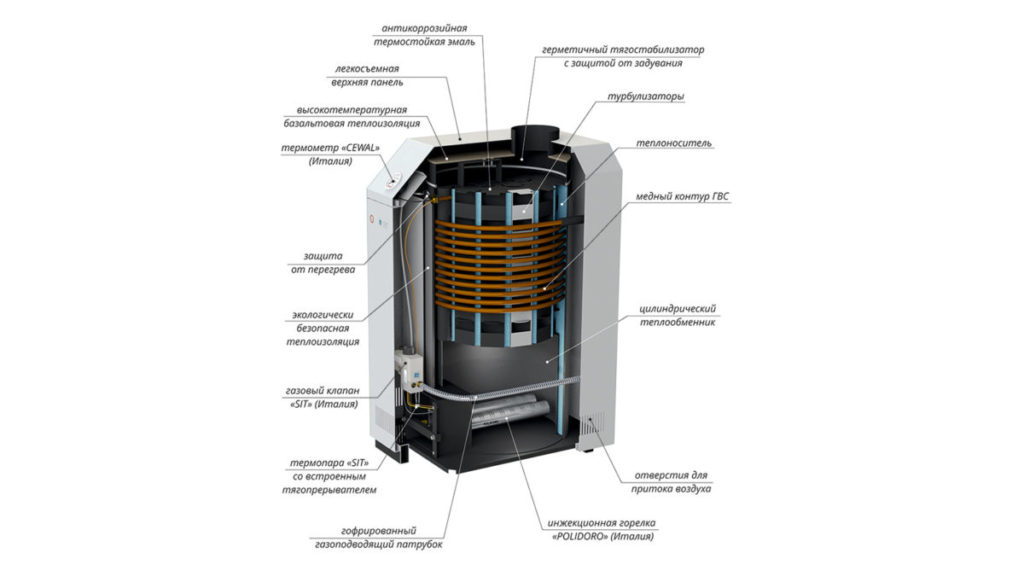 Устройство котлов стандартное для большинства отечественных моделей: известная итальянская автоматика EuroSit и горелки Polidoro. Такая конструкция подразумевает, что в ней попросту нечему ломаться. Стальные теплообменники выполнены из высококачественной стали, которая до сегодня не вызывает вопросов, однако ее толщина всего 2 мм против 3-4 мм у аналогов. Надежно и проверенно временем, но факт остается фактом.