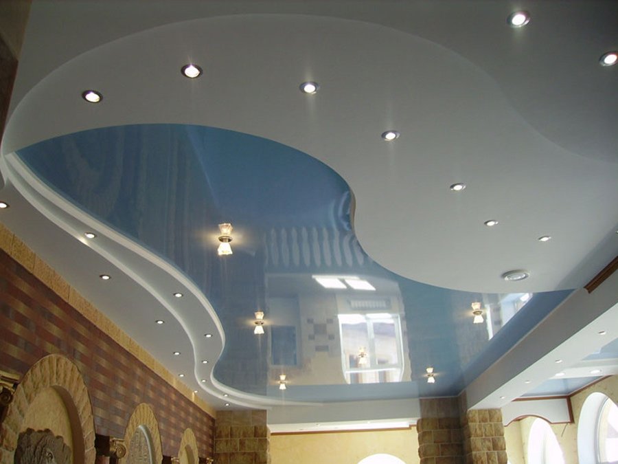 - освещение. При использовании глянцевого полотна можно реализовывать самые необычные световые решения с лампами высокой мощности. С матовым полотном выбор освещения скуден, можно использовать только слабые лампы, чтобы не испортить покрытие;
