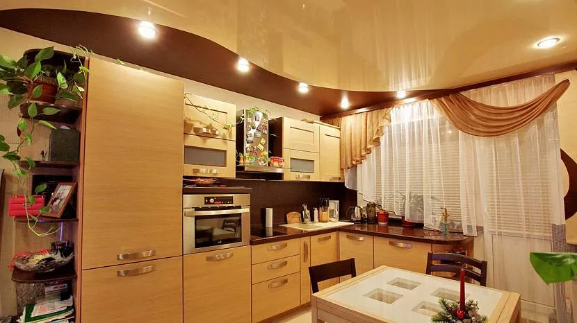 | Есть возможность спрятать коммуникации и проводку. Так, например, при установке натяжного потолка можно оснастить кухню точечными светильниками и повесить люстру прямо над столом. | Наличие швов на виниловых потолках (при большой площади кухни). Во-первых, швы, хоть и малозаметны (их толщина составляет менее 1 мм), но могут быть видны при пристальном рассмотрении. Во-вторых, швы являются слабым местом виниловых потолков. При некачественной сварке или из-за слишком сильного натяжения при установке полотно может порваться именно по шву (такое происходит не часто). |