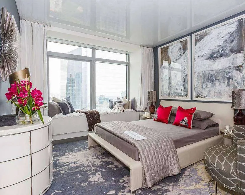 Глянцевый потолок любого оттенка перетягает на себя внимание, он является идеальным вариантом для комнат с невысокими потолками
