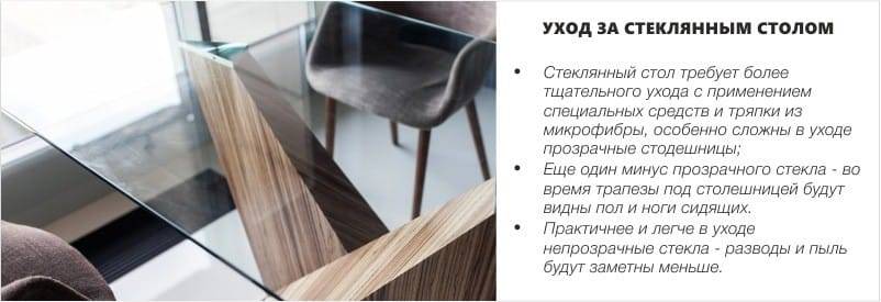 - также в отзывах часто пишут о том, что прозрачные обеденные столы из стекла не самый лучший выбор, так как видны ноги сидящих и пол;