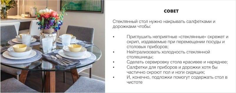 Обратите внимание, что если подкладывать под посуду салфетки, то стук и вовсе не будет слышен. Что касательно пятен, то протирать нужно будет любой стол, а убрать отпечатки со стеклянной поверхности можно при помощи тряпки с микрофиброй