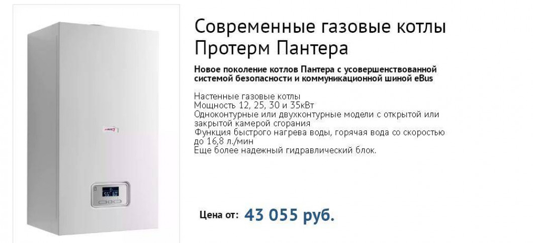 «Пантеры» — мощные и безопасные устройства, которые мало шумят и просты в управлении. Благодаря системе «Комфорт», отвечающей за скорость подогрева воды, пользование ГВС становится максимально удобным. Есть еще новинка, которая упрощает управление – коммуникационная шина «eBUS», вмонтированная в экран. Это оборудование среднего класса. Стоимость – 45-66 000 рублей. Сколько стоит та или иная модель, зависит от мощности. Серия относится к бюджетным версиям. «Пантеры» выпускаются в трех модификациях: