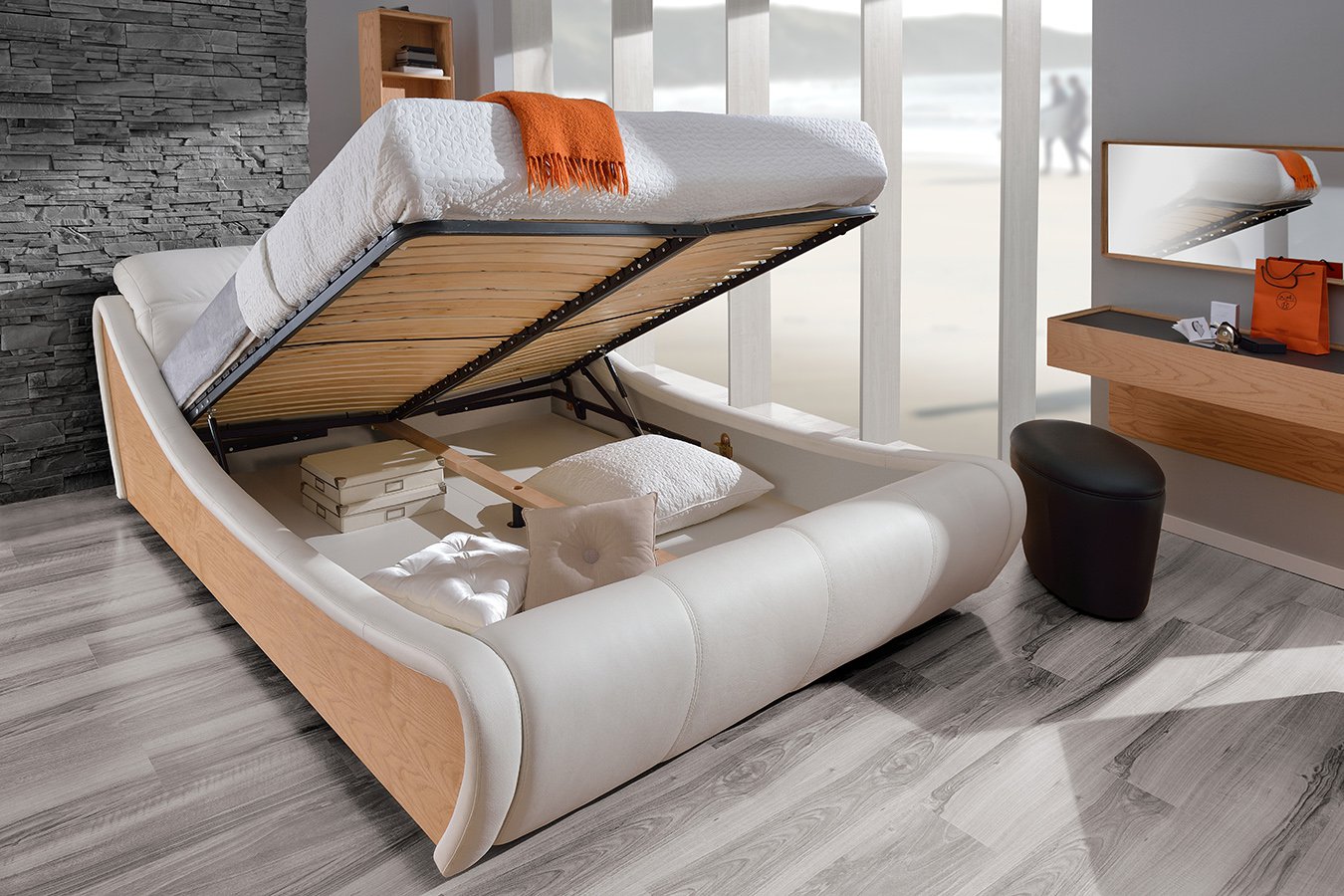 Менее требовательными можно назвать обычные на первый взгляд кровати с необычным механизмом, который позволяет ее либо складывать, либо открывает вышеупомянутое пространство для удобного хранения вещей. Обычно их каркас выполнен из массива или ДСП. Подъемный механизм выполнен из металлической фурнитуры со специальными вставками, позволяющими поднимать-опускать лежак на необходимую высоту, при этом совершать движения достаточно легко, а также фиксировать кровать. Второй вариант обязательно имеет подъемный механизм. Разница в том, на какой угол и для чего он рассчитан.