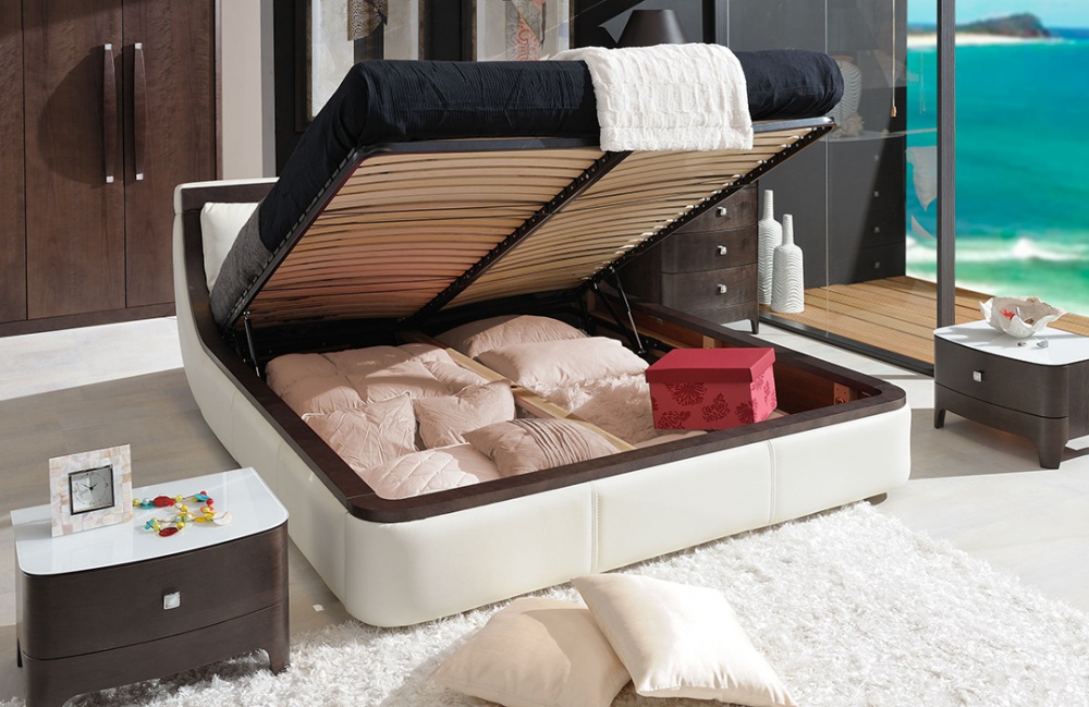 Кровать с вместительным пространством из недостатков может иметь только тот самый размер, который, в сравнении с диванами, невозможно уменьшить. Но в данном случае все будет зависеть скорее от размеров помещения. И в большой просторной спальне, например, хорошая двухспальная кровать будет идеально смотреться. Сколько примеров удачных фото интерьеров, где главным акцентом является роскошная кровать. К тому же явное преимущество — пространство под ней, когда можно освободить место, сделав интерьер более аккуратным.